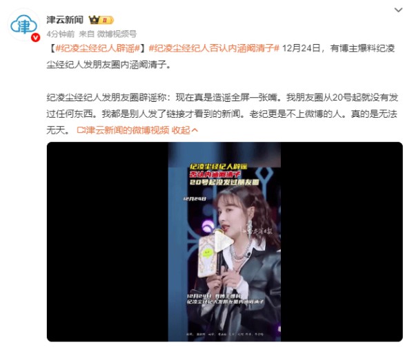 12 月 24 日,有博主爆料称,纪凌尘的经纪人曾发布朋友圈,疑似内涵阚清子。对此,纪凌尘经纪人发朋友圈辟谣称:现在真是造谣全屏一张嘴。我朋友圈从20号起就没有发过任何东西。我都是别人发了链接才看到的新闻。老纪更是不上微博的人。截图都没有半张就敢造谣,真的是无法无天。