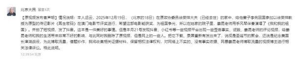 2025年12月19日,在原政协委员徐荣祥大夫(已经去世)的家中给他妻子李莉回国参加以徐荣祥教授为原型的传记影片《再生密码》在澳门电影节评奖送行,希望这部电影能获奖,为祖国争光。所以,在她家的院子里,姜昆老师用手风琴伴奏演唱了《我和我的祖国》,并拍了短视频,发了抖音,这本是一件美好的事情,但是本月21号发现,抖音,小红书等一些平台出现一些歪曲事实,诋毁姜昆老师的评论视频,给姜昆老师和我的生活带来非常不好的影响。与此同时,我删除了原视频,但是网上一些人把它下载录屏,重新又发出来了,说成是圣诞节的聚会,还说是纪念美国长津湖战役,为此博流量借题炒作!