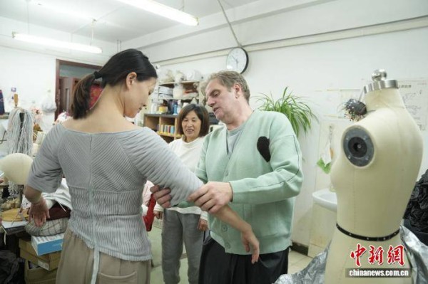 11月27日,导演大卫・多伊阿什维利(右一)到剧装厂为女主角黄薇商定服装的修改方案。中新社发 史春阳 摄