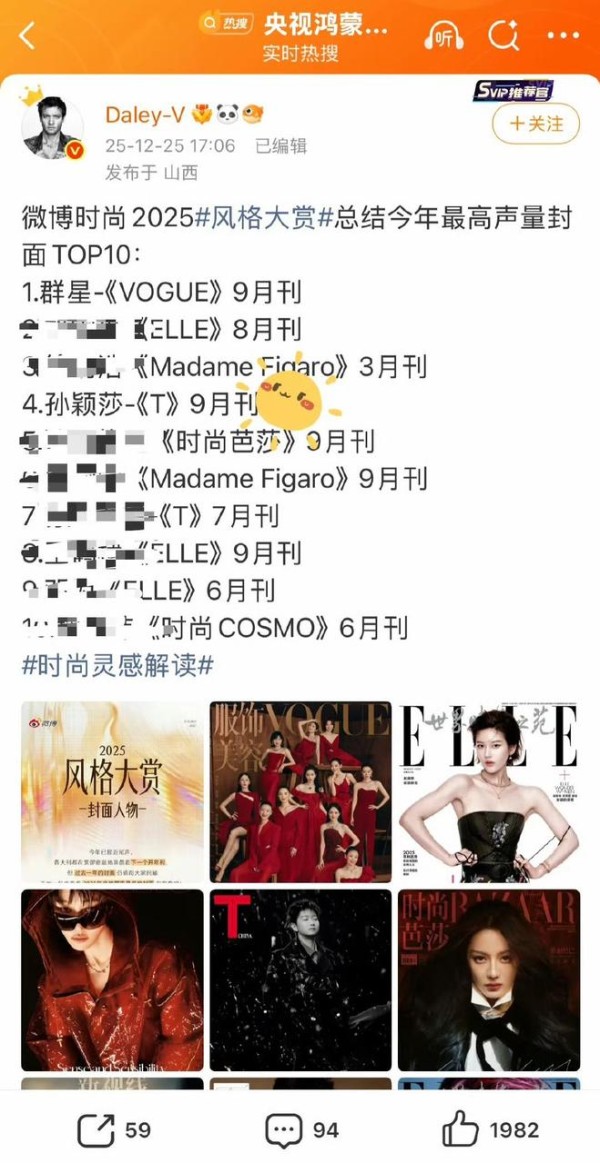 近日,在微博时尚官方发布的“2025风格大赏”年度封面声量Top10中,孙颖莎以《T Magazine中文版》2025年9月刊封面人物的身份登上榜单,位列年度最高声量封面第四名,且是唯一入选该榜单前十的运动员,引发广泛关注。