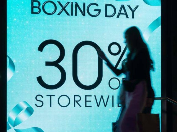 ↑12月26日,一名女子从加拿大多伦多的“节礼日”促销广告旁经过。新华社发(邹峥摄)