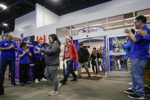 ↑12月26日,加拿大温哥华一家电子产品商店的工作人员在节礼日促销期间迎接顾客。新华社发(梁森摄)
