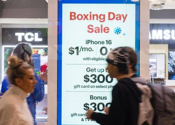 ↑12月26日,人们从加拿大多伦多商业区的“节礼日”促销广告前经过。 新华社发(邹峥摄)
