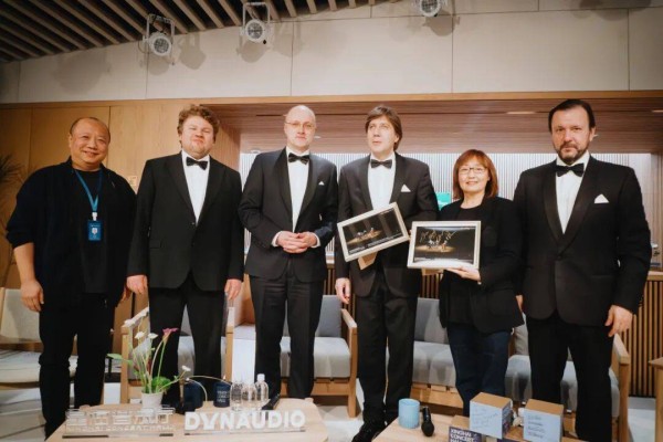 星海音乐厅主任王冬云、副主任杨震与鲍罗丁四重奏互赠演出签名照片作为音乐会纪念。