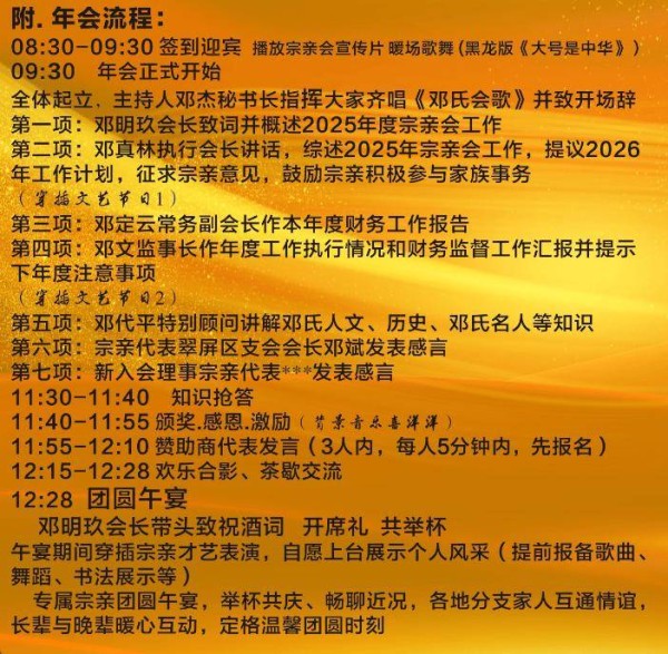 当然我们也深知还有不足:部分宗亲因地域或事务未能参与,活动形式仍可更丰富。新的一年,我们将重点做好三件事:一是拓宽联络渠道,让更多邓氏家人加入大家庭;二是创新文化活动,让家风家训在新时代焕发生机;三是深化宗亲互助,在事业发展、生活帮扶上搭建更坚实的平台。