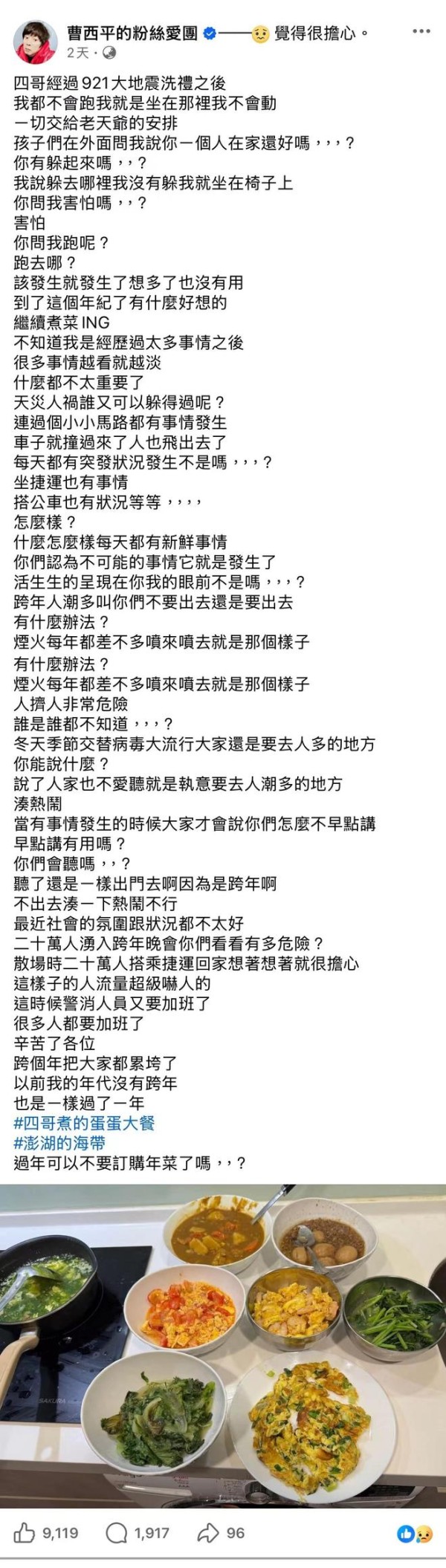 曹西平在28日还在社交账号发文关于地震的事,称经历过921大地震后不再逃跑,一切交给老天爷安排,并提醒大家注意跨年人潮安全隐患,感觉也是一语成谶,网友感叹生命无常。