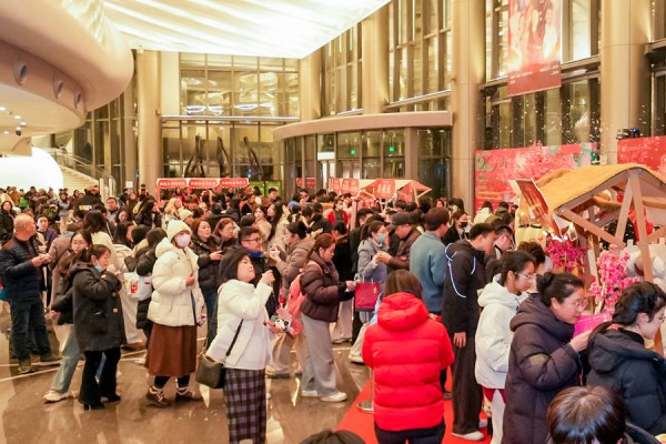 幕布尚未升起,艺术的涟漪已然荡开。《垂虹别意·唐寅》上演前,九棵树艺术中心的大厅里展开了一场流动的“桃花宴”,人造雪花从桃枝间静静飘落,非遗市集的暖光映照着江南冬夜。摊位前人头攒动,不少观众驻足观赏奉贤的土布染织技艺与琉璃烧制技艺。大家手捧热气氤氲的奉贤非遗“李记羊肉”,美食暖香为冬日增添温情。
