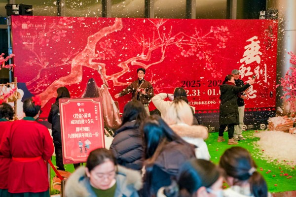 艺术体验早已延伸至舞台之外:《垂虹别意·唐寅》演出前,剧场大厅化身为“桃花宴”主题空间,人造雪花与非遗市集相映成趣;《牡丹亭》主创则走进同济大学,与年轻学子促膝长谈。从市集的烟火气到校园的思想碰撞,从舌尖的体验到心灵的共鸣,艺术成为可以触摸、品味、对话的鲜活存在,传统文化亦悄然融入当代生活的脉络。