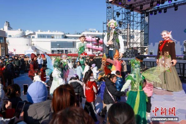1月2日,元旦假期,乌镇戏剧节开年大巡游——《艾尔夫奇境之旅》在北京城市副中心商业地标——“湾里”上演。图为巡游演员与市民互动合影。中新社记者 贾天勇 摄