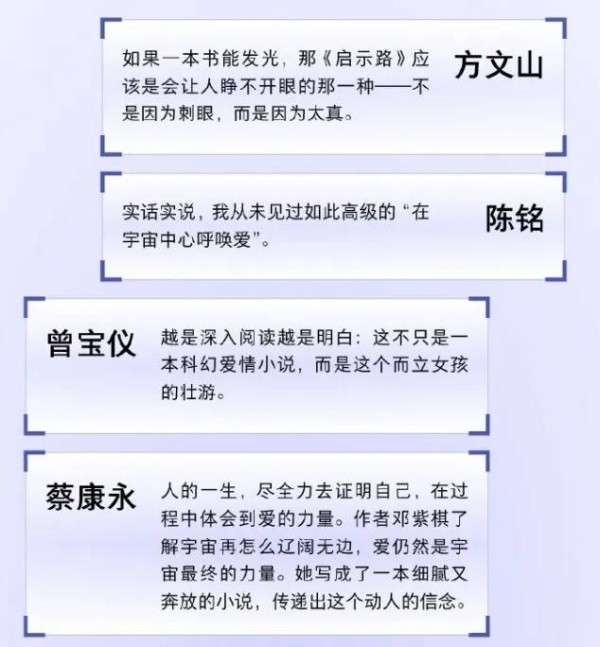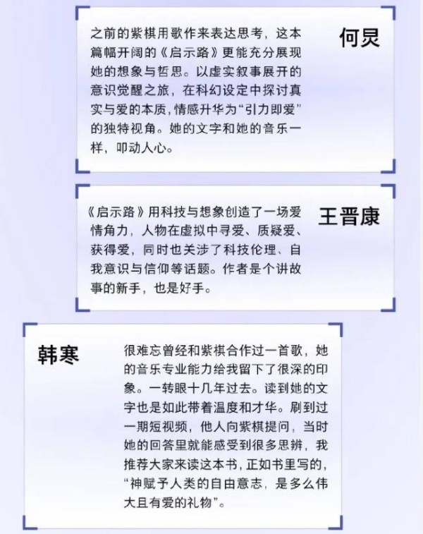 何炅写道:“之前的紫棋用歌作来表达思考,这本篇幅开阔的《启示路》更能充分展现她的想象与哲思。她的文字和她的音乐一样,叩动人心。”