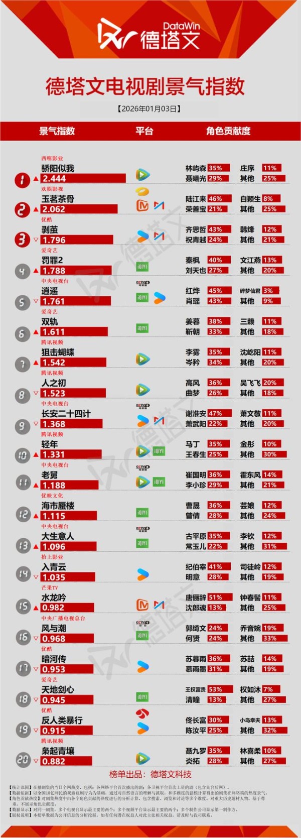 骄阳似我(林屿森 35% 聂曦光 29%) 玉茗茶骨(陆江来 46% 荣善宝21%) 剥茧(齐思哲43% 祝青越24%) 罚罪2 逍遥 双轨 狙击蝴蝶 人之初 长安二十四计 轻年 老舅 海市蜃楼 大生意人 入青云 水龙吟 风与潮 暗河传 天地剑心 反人类暴行 枭起青壤