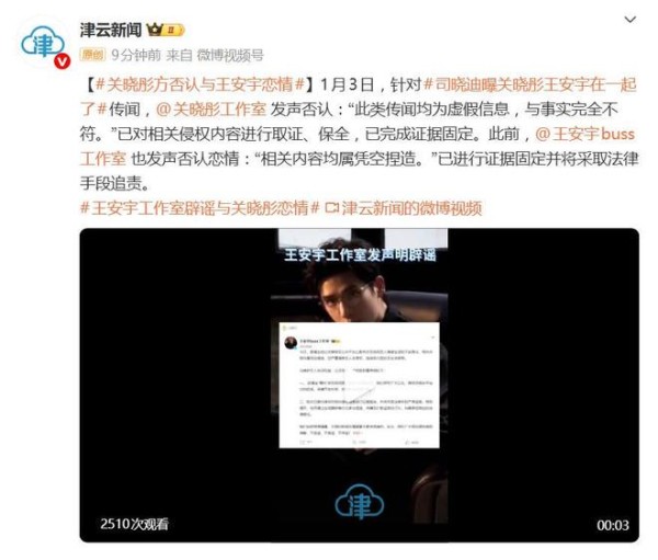 面对这种“开局一张嘴”的传闻,当事人反应堪称雷厉风行。王安宇工作室在1月3日早上八点就率先出击,声明直指相关内容“均属凭空捏造”,并已完成证据固定,准备法律追责。关晓彤工作室紧随其后,明确表态“此类传闻均为虚假信息,与事实完全不符”,同样完成了取证和保全。双方声明措辞一致,行动同步,摆出了联手“打假”的强硬姿态。