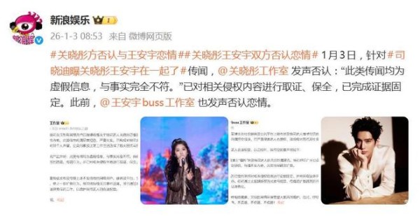 2026年刚开年,娱乐圈的“瓜”就来得猝不及防。1月3日,关晓彤与王安宇双方工作室几乎同步甩出严正声明,将一则刚冒头的恋情绯闻锤得粉碎,速度快得让吃瓜群众都差点没跟上节奏。
