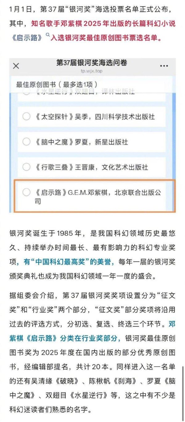 4日,有媒体报道称,1月1日,第37届银河奖海选投票名单正式公布,其中,知名歌手邓紫棋2025年出版的长篇科幻小说《启示路》入选银河奖最佳原创图书票选名单。随后,邓紫棋本人也发文晒图称自己入选了银河奖。