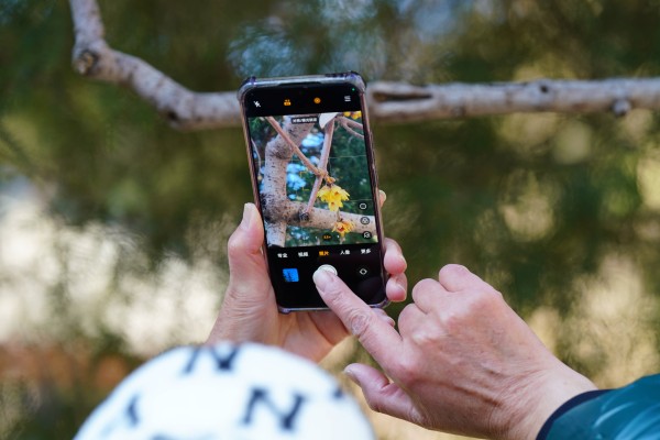 1月10日,游人在北京卧佛寺拍摄腊梅。 新华社记者 樊雨晴 摄