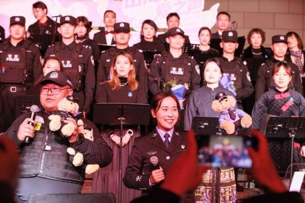 当晚的演出中,一段特殊的合唱让现场气氛格外热烈。在《祖国不会忘记》激昂的旋律中,一群身着制服的警察悄然加入合唱团,整齐的队列、庄重的神情与深情的演唱,瞬间点燃全场。当天恰逢第六个“中国人民警察节”,本该休假的他们依然坚守岗位,在现场执勤护航。演出间隙,小朋友们捧着鲜花走向警察叔叔,稚嫩的问候与真挚的敬意让现场暖意融融。现场有两位警官通过防诈小问答、赠送警察小熊的形式普及反诈知识,“陌生链接不点击,可疑来电多核实”,互动问答引发市民激烈抢答,在轻松氛围中筑牢安全防线。