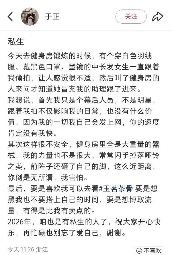 他在文中最后调侃道:“2026年,咱也是有私生的人了。”此次发文引发网友关注,不少人对幕后工作者也遭遇此类骚扰表示意外。