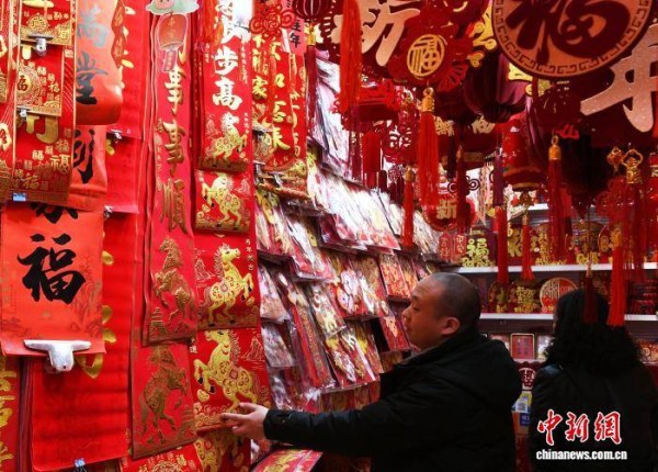 1月12日,市民在重庆一批发市场选购新春饰品。随着丙午马年的临近,当地一家批发市场上新了灯笼、春联、年画、福字、马元素装饰品等洋溢着节日气氛的年货。中新社记者 周毅 摄