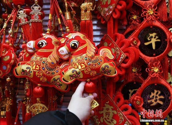 1月12日,市民在重庆一批发市场选购马元素新春饰品。随着丙午马年的临近,当地一家批发市场上新了灯笼、春联、年画、福字、马元素装饰品等洋溢着节日气氛的年货。中新社记者 周毅 摄