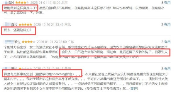 在观看《在线追踪》《贪吃蛇》两部作品后,文娱价值官对小红书孵化的短剧作品有了明确的认识:风格鲜明、高制作门槛、类型多元。而打造题材新颖、电影质感的精品短剧,成为小红书短剧打造的又一个市场突破口。