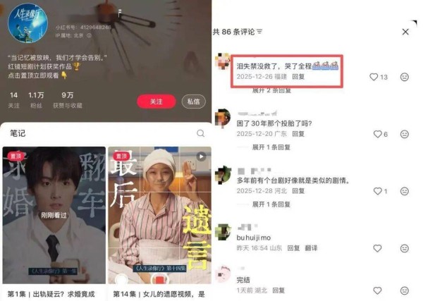 文娱价值官此前关注了红镜计划推出的《人生录像厅》,一共51集,目前在小红书短剧频道是完播状态,这部短剧属于温暖治愈的类型,用户点赞和评论等反馈尤为积极,最后一集的高赞留言是:“泪失禁没救了,哭了全程。”