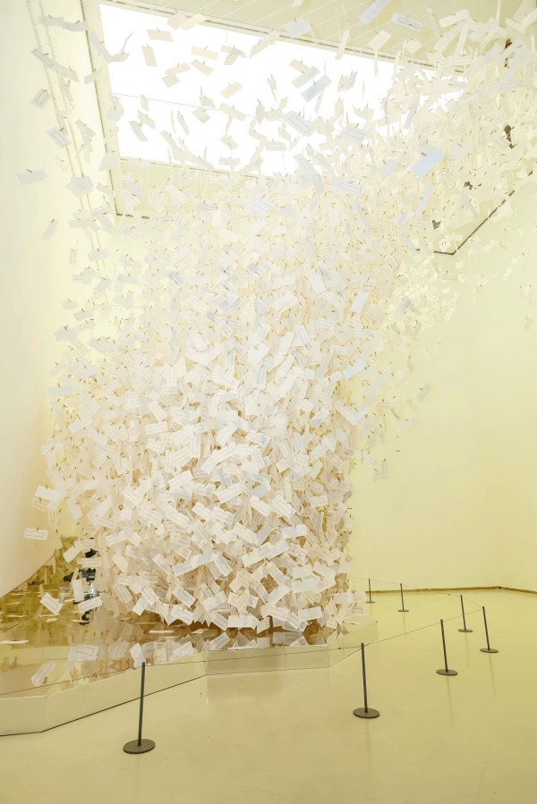 冯羽表示,在人工智能和互联网时代,信的功能逐渐消失,人与人交往中的温度感也不再浓郁。而齐白石是中国艺术家中特别有温度的一位,书信正是连接他与观众的最佳媒介。在“白石来信”的创作中,冯羽注重装置的“在地性”。面对12米高的展厅空间,他设计了一只抽象的振翅而飞的北方信鸽形态,一封封悬挂的信件犹如鸽子飞散时飘落的羽毛。“冬天虽然寂寥,鸽子飞翔起来依然很温暖。”冯羽说,鸽与信关系紧密,这一设计既契合北方生活场景,又为传统水墨展览注入当代气息。