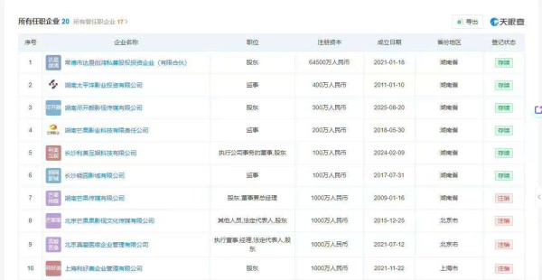 天眼查数据显示,目前李湘名下关联的20家企业,其中14家已注销,仅6家企业续存,注销比例高达70%。李湘在存续的企业中担任股东、执行董事或监事等职务,业务覆盖影视投资、企业管理等领域。(封面新闻)