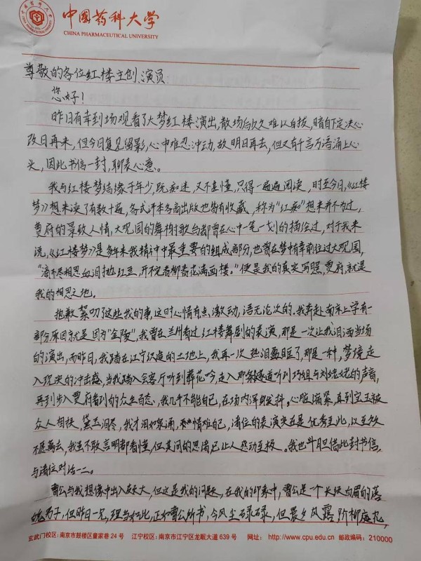 自首演以来《大梦·红楼》收获掌声无数,有陪伴父母亲友多刷的观众,也有专程为了这场演出奔赴南京的游客,还有远道而来的外国友人,大家在这场演出中找到情感共鸣。在新版《大梦·红楼》开演后,这样动人的故事还在继续,在1月2日晚的演出结束后,主创团队收到了一封来自中国药科大学的学生观众的手写长信,“这个同学已经是三刷了,自己看过后又带着同学过来看,非常爱这部剧。”在信中这位同学写道:“那是一种,梦境走入现实的冲击感,当我踏入会客厅听到葬花吟,走入那条隧道听到巧姐和刘姥姥的声音,再步入贾府看到的众生百态,我几乎不能自己……诸位的表演实在是优秀至此,以至久久不愿离去,我虽不敢言明都看懂,但其间思绪已让人感动至极。”这位同学用满满当当四页信纸写下了自己观看《大梦·红楼》的感受,对演员们的演出给予了肯定,收到这封长长的手写信大家也是感动得不行,“非常感动,我们的表演可以获得观众这样的喜爱和认可,这对我们来说是莫大的鼓励。”