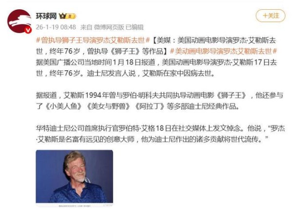 据1月19日报道,一则突如其来的消息,让全球动画迷的心沉了下来。据外媒报道,迪士尼传奇动画师、经典巨制《狮子王》的联合导演罗杰·艾勒斯,于2026年1月17日在家中因病去世,终年76岁。迪士尼官方发言人随后确认了这一令人惋惜的消息。