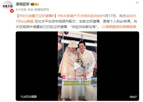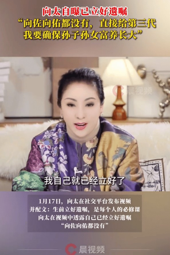 1月17日,向太在社交平台发布视频并称:“生前立好遗嘱,是每个人的必修课。”向太透露自己已经立好遗嘱,“向佐向佑都没有,直接留给你们的下一代,我该给的都给了,就是你们要拍电影、要创业的,我都给了,我要确保我的第三代要富养的长大,孙子孙女都要富养,那我们就开心了。”