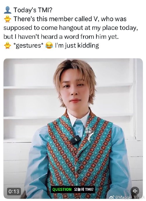 笑死Jimin 说:“有一个叫V的成员本来说好今天要去我家,但到现在我还没有得到他任何消息。” 感觉要被放鸽子