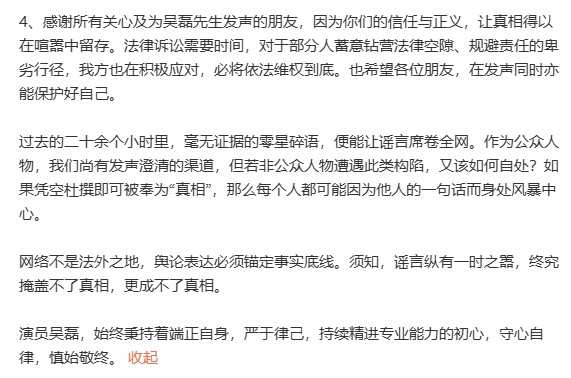 针对这一系列造谣行为,吴磊工作室第一时间发布严正声明,指出该网络用户的言论均为毫无事实依据的谣言。工作室强调,各平台上涉及吴磊的不实信息,都已委托律师依法完成证据固定,后续必将通过一切法律途径,追究侵权者的相关责任。