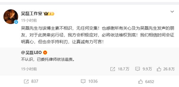 1月19日中午,吴磊发文回应白珊珊,“不认识,已委托律师依法追责。” 随后,吴磊工作室评论:“吴磊先生与该博主素不相识,无任何交集!”