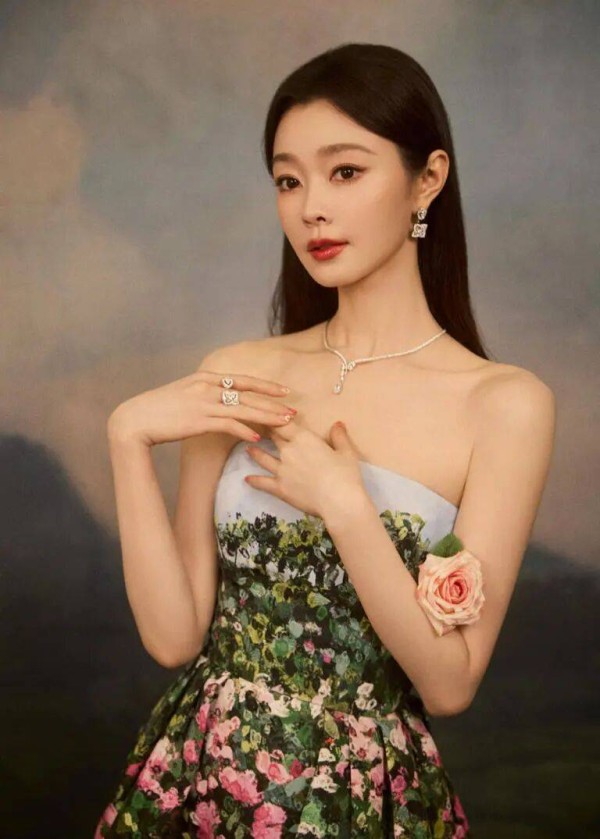 墨绿裙裾上的粉白花卉实为当代刺绣工艺对宋代缂丝的致敬,每片花瓣的银线勾边都是云纹的数字化转译。她捧花的姿势暗藏玄机:拇指与食指构成黄金分割点,藤蔓垂落的弧度精确计算过与裙摆开衩的呼应关系。背景远山采用没骨技法晕染,而钻石项链的星芒切割面却反射着LED补光灯,这种传统绘画材料与当代光学技术的碰撞,恰是新中式美学的核心密码。当耳畔水滴珍珠随着转头角度改变光路,仿佛能听见李清照"和羞走,倚门回首"的平仄韵律。