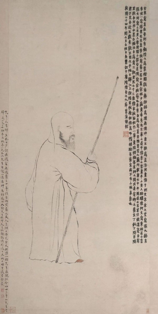故宫博物院藏金农《自画像》,衣纹以焦墨渴笔勾勒,颇似南宋马和之“兰叶描”技法,线条生拙简朴,整作体貌诙谐,如漫画似素描,尤是发辫、长髯的写实刻画,老翁逍遥自在、大智若愚的形象,趣味弥散。而苏州博物馆藏金农《香林扫塔图轴》画一蓬头垢面的草履沙弥,正在打扫寺塔,渴笔写芒鞋、扫帚,水墨晕染粗布袍服,逸笔草草,富有深邃禅意及动感韵律。尤是背向的构图,面部微露,亦是奇特。金农,又号“吉金”,“金”字梵语为“苏伐罗”,本幅款识“苏伐罗吉苏伐罗”,天马行空的艺术奇思创造,更可谓前无古人。