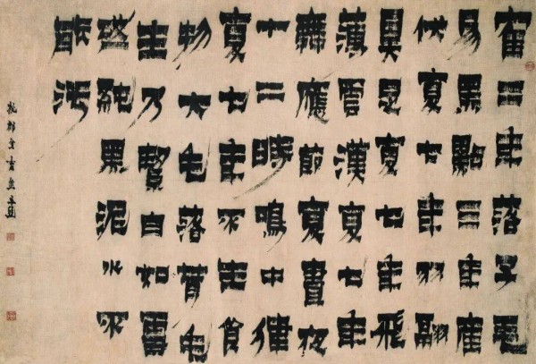 金农对于颜楷曾下苦功,隶书则初师郑簋,而后又致力于《汉华山庙碑》,自慨“华山片石是吾师”。其书变革后,又以漆书最为经典,个人面目独具。所谓“漆书”,大体是运笔扁方,竖轻横重,只折不转,大巧若拙,金农称之“渴笔八分”,罗聘有诗赞云“冬心先生真吾师,渴笔八分书绝奇”。蒋宝龄《墨林今话》中亦称金农“书工八分,小变汉人法,后又师《国山》及《天发神谶》两碑,截毫作擘窠大字,甚奇。”