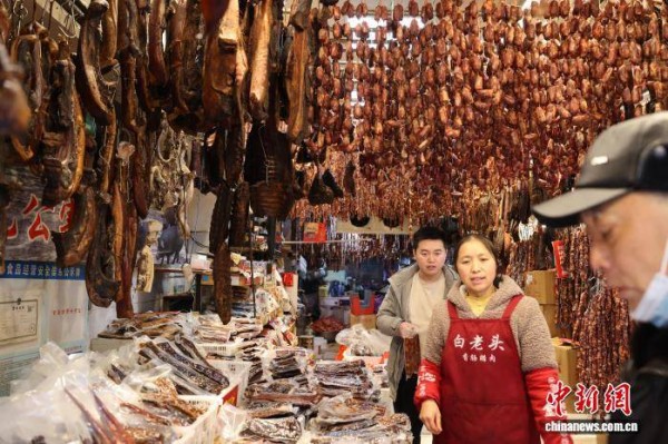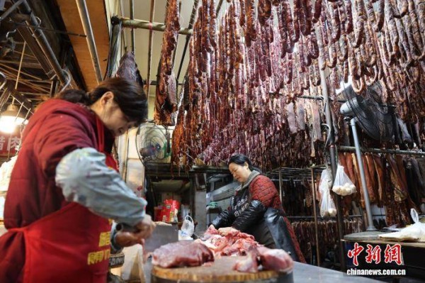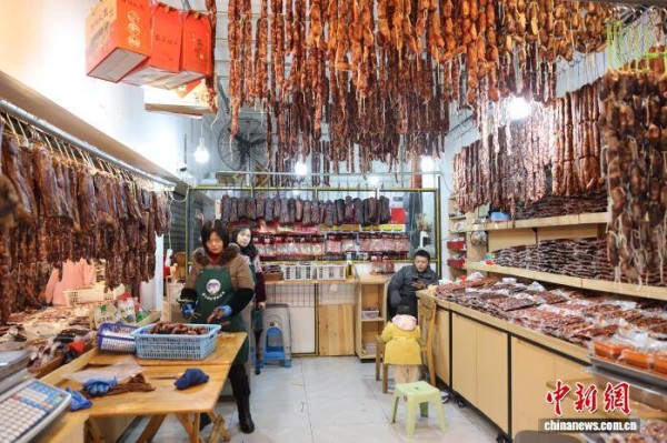 1月21日,四川省成都市新开寺街一家肉铺吸引顾客。中国农历春节将至,有着“香肠一条街”之称的成都新开寺街各家肉铺逐渐忙碌起来,腊肉、香肠飘香整条街道。中新社记者 张浪 摄