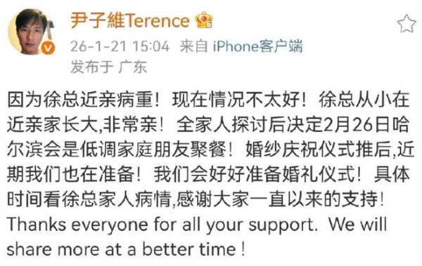 一月二十一日,尹子维在自己的微博上,发了一条婚礼推迟声明。