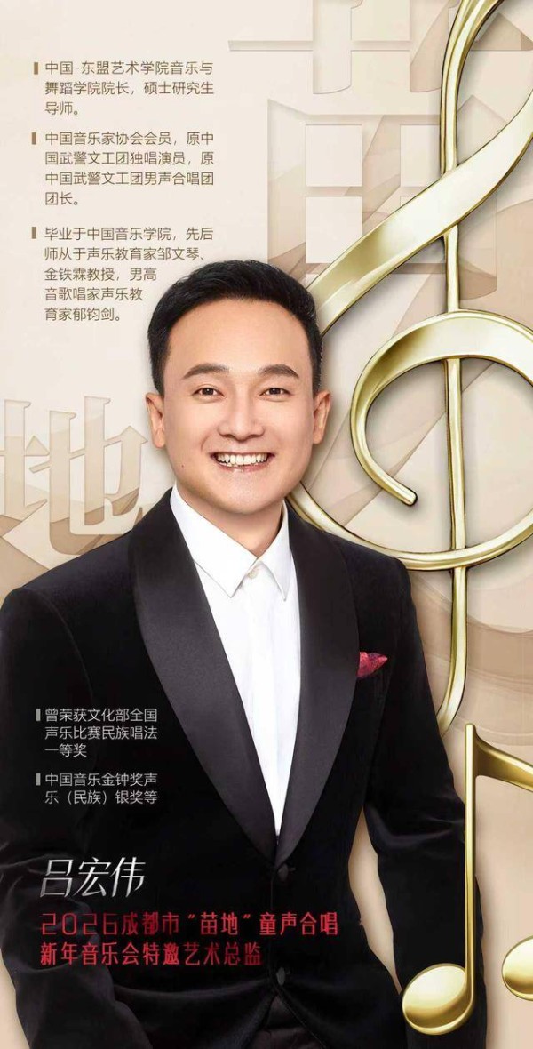 担任本次音乐会艺术总监的吕宏伟,曾以《故乡有话告诉你》《又唱小白杨》《棒棒捶在岩头上》《扎西德勒》等著名歌曲活跃在舞台多年,现担任成都大学中国-东盟艺术学院音乐与舞蹈学院院长。从事高校音乐教育的他,也对这场童声盛会满怀期待:“当孩子们清澈的歌声在音乐厅中响起,我们听见的不只是旋律,更是美育在校园与城市间悄然生长的声音。”