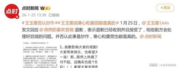 王玉雯回应《突然的喜欢》官微道歉,否认此事是炒作