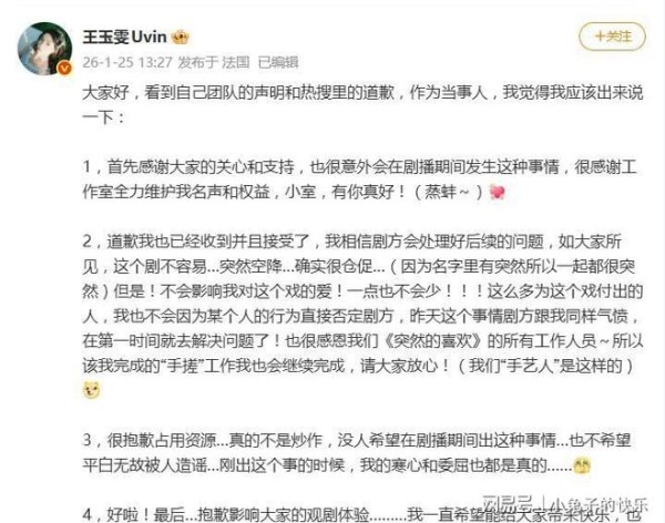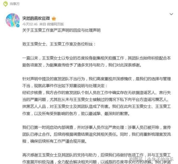 在舆论压力下,剧方《突然的喜欢》官微于当日02:46做出回应,承认了宣发团队存在“造谣抹黑合作演员”的行为,宣布已开除直接涉事人员、终止与整个外包宣发团队的合作,并承诺整改内部流程,向王玉雯团队致歉。