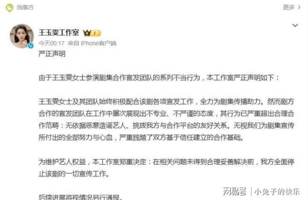 这场风波的起因,堪称娱乐圈“职场背锅”的典型剧本。据王玉雯方陈述,她严格遵照剧方要求,在合作平台按日发布剧宣物料,尽职尽责。剧方外包的宣发团队却向平台谎称这些是“艺人自行策划”,导致王玉雯无端被平台问责。这波“神操作”还没完,该团队为进一步推卸责任,竟开始捏造并散布王玉雯“挑拨平台关系”、“品性不佳”等谣言,试图将脏水彻底泼向艺人。