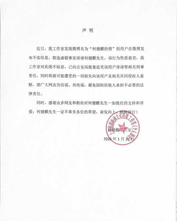 1月25日晚,自称何健麒前女友的网友“何健麒的债”在社交媒体平台实名举报何健麒涉毒。对此,何健麒工作室在社交平台上发声明辟谣,称该用户发布不实信息、捏造虚假事实诽谤,该行为性质恶劣,我工作室对此绝不姑息,已向公安局报案追究该用户诽谤罪相关刑事责任。