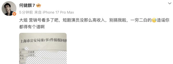 随后,何健麒本人晒出报案回执,并发文回应道:“大姐,营销号看多了吧,短剧演员没那么高收入,别搞我啦,一穷二白的,造谣你都得有个谱啊。”