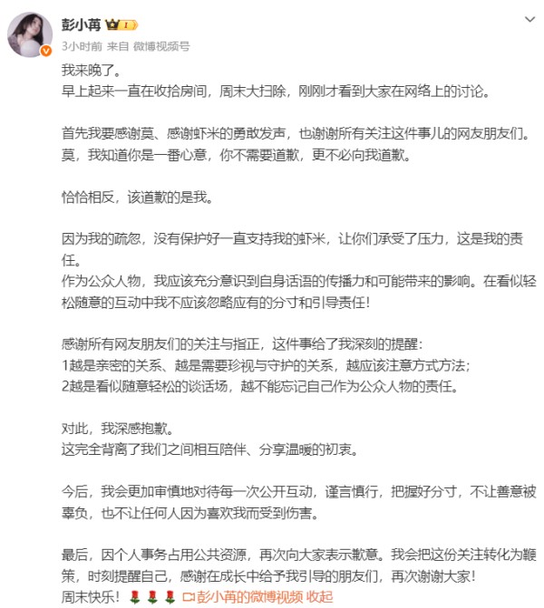 彭小苒发视频向粉丝道歉:会谨言慎行,不让善意被辜负