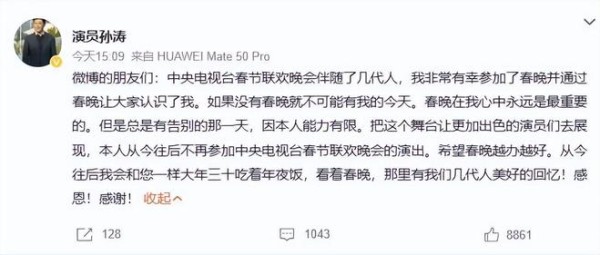 在孙涛对闫学晶事件做出澄清之后,1月26日,孙涛在个人账号正式发文宣布告别春晚。