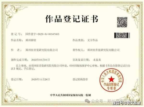 近日,郑州窑青瓷研究院收到国家版权局邮寄的版权登记证:郑州窑青瓷研究院申请的文字版权“郑州御窑”2025年11月28日由中华人民共和国国家版权局正式通过批准。“郑州御窑”国家版权登记号为“国作登字-2025-A-00347403”,这是郑州窑青瓷研究院的又一项研究成果被国家版权保护。目前,郑州窑青瓷研究院获得国家和河南省版权保护的数量有40余项,其中包含郑州窑和郑州青瓷、郑州窑图案、郑州窑印章、郑州窑研发的系列作品等。同时,郑州窑还申请了汉语拼音、英文等系列商标。