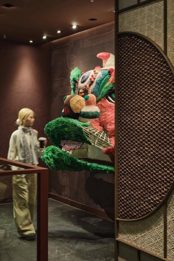 店内多处非遗打卡点堪称跨域融合的典范:一楼吧台墙面的像素脸谱,以云南藤编为基底,用潮流像素化手法重构粤剧经典脸谱,悄悄融入咖啡豆纹理与咖啡器具元素,老技艺与新表达碰撞出独特视觉火花;二楼楼梯端景墙的非遗醒狮,巧妙地融合了粤剧戏服面料、竹编工艺与星巴克标志性绿围裙元素,将广府文化的“代言人”赋予非遗新生的美好寓意。