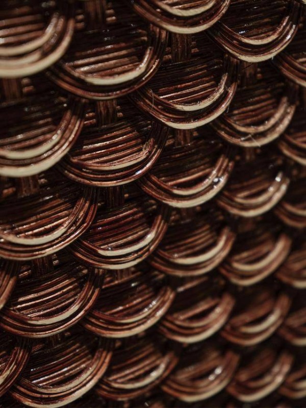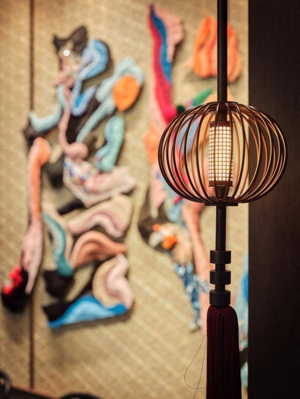 值得一提的是,藤编非遗传承者陈艳秋女士打造的《藤鳞戏韵》,以腾冲天然老藤为材,用“错缝叠压法”编织出鱼鳞韵律,作品中的复古红既呼应粤剧戏台,又契合深烘咖啡豆的醇厚色泽,成为空间中不动声色的匠心点缀。此外,由艺术家设计创作的《粤韵成章》,以拼贴技艺织就“睇戏”二字,金线珠片与龙纹凤绣隐现其间,让粤韵之美在细节中流转。