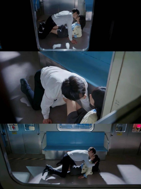 “地铁吻”应该是目前为止剧中最出圈的桥段,将近3分钟的吻戏切片在各大视频平台均有热度,不少观众也因此被吸引而来。这段戏的时长和氛围在短剧中都不多见,加上色调和运镜,颇有几分韩剧的质感。